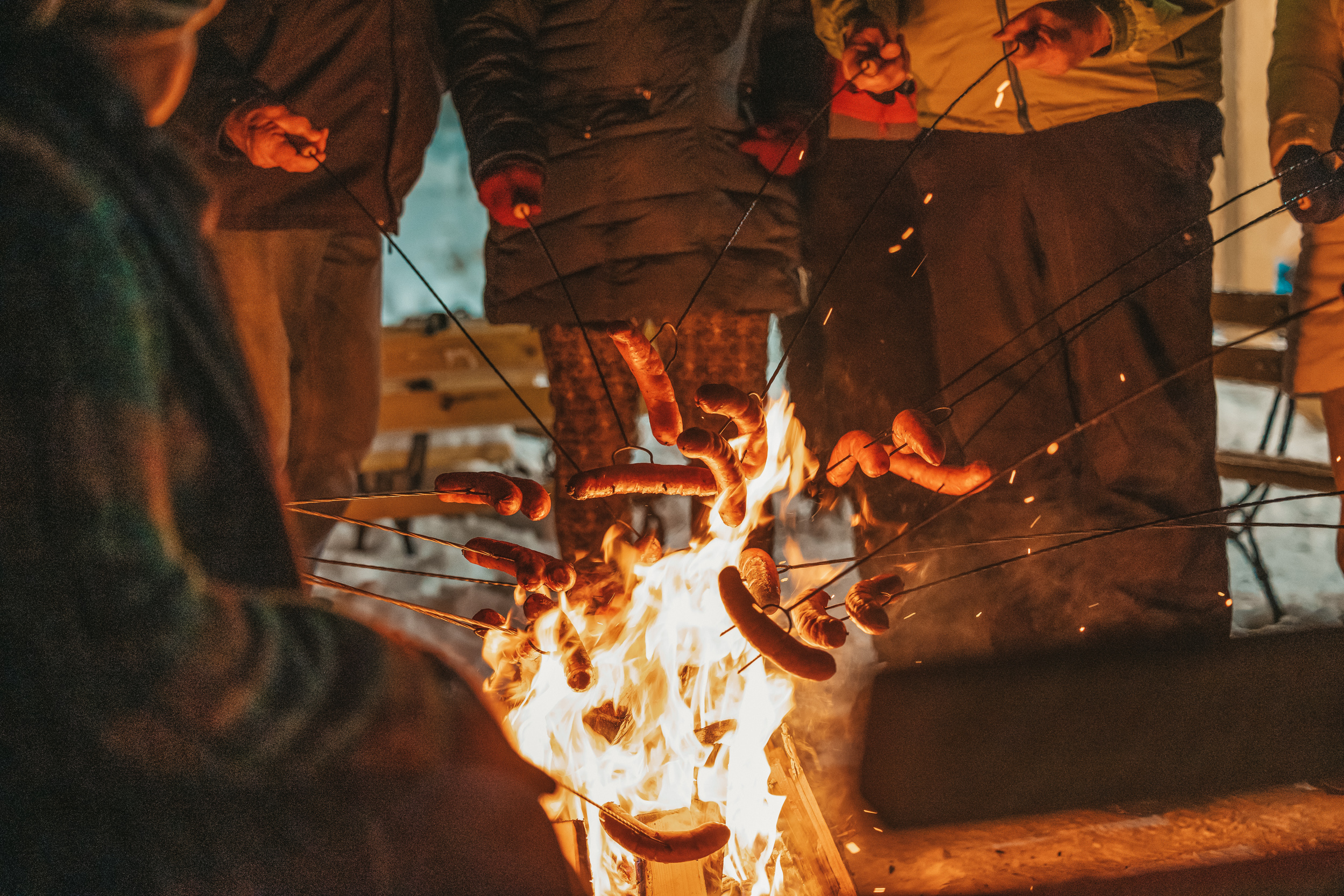 Na końcu trasy czeka na Was skryta w lesie, nastrojowa drewniana chata – zadaszona, ciepła, z pełnym zapleczem i toaletą. Na zewnątrz, wśród zimowej scenerii płonie ogień, pachnie herbatą, kiełbaskami i lasem. To tutaj rozpoczyna się biesiada.